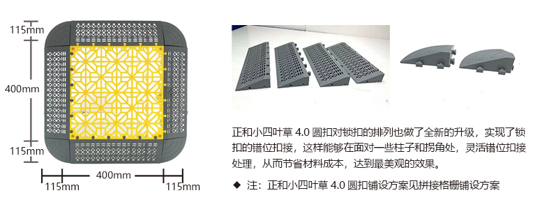 正和小四葉草4.0圓扣采用通扣設(shè)計,可以確保產(chǎn)品鋪設(shè)完成后在任何區(qū)域單獨取出,極大的方便了客戶后期局部清理泥沙等,給店面的日常衛(wèi)生維護(hù)提供了很好的基礎(chǔ)。
