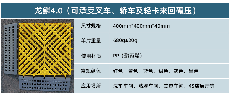 1.龍鱗紋設(shè)計(jì),防滑,美觀,寓意好 2.選用高級原料,加入其他輔料,顏色亮麗,無異味,無污染 3.顏色為紅黃藍(lán)綠黑灰六色,滿足客戶用色需求,搭配屬于自己的風(fēng)格 4.通扣鎖扣設(shè)計(jì),容易鋪設(shè)且容易拆卸打理 5.加強(qiáng)支撐,不容易出現(xiàn)壓壞壓斷現(xiàn)象,滿足大多數(shù)車輛施工的要求 6.使用年限長,3年超長質(zhì)保,使用無后顧之憂 7.不同厚度,采用不同支撐,保證承載最大化的同時(shí),且易排泥排水
