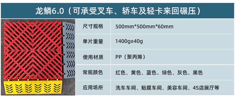 1.龍鱗紋設(shè)計(jì),防滑,美觀,寓意好 2.選用高級(jí)原料,加入其他輔料,顏色亮麗,無(wú)異味,無(wú)污染 3.顏色為紅黃藍(lán)綠黑灰六色,滿足客戶用色需求,搭配屬于自己的風(fēng)格 4.通扣鎖扣設(shè)計(jì),容易鋪設(shè)且容易拆卸打理 5.加強(qiáng)支撐,不容易出現(xiàn)壓壞壓斷現(xiàn)象,滿足大多數(shù)車輛施工的要求 6.使用年限長(zhǎng),3年超長(zhǎng)質(zhì)保,使用無(wú)后顧之憂 7.不同厚度,采用不同支撐,保證承載最大化的同時(shí),且易排泥排水